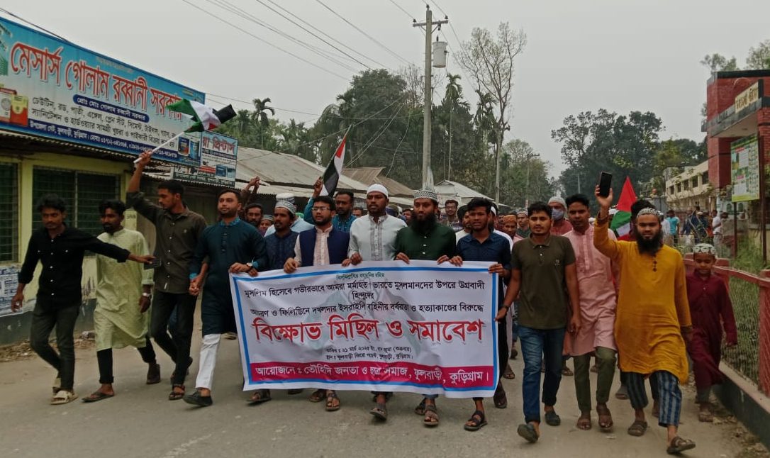 ফুলবাড়ী (কুড়িগ্রাম) প্রতিনিধি: ফিলিস্তিনে উপর ইসরায়েলের গণহত্যা ও ভারতের মুসলমানদের উপর উগ্রবাদী হিন্দুদের হামলার প্রতিবাদে কুড়িগ্রামের ফুলবাড়ীতে বিক্ষোভ মিছিল ও পথসভা অনুষ্ঠিত হয়েছে।