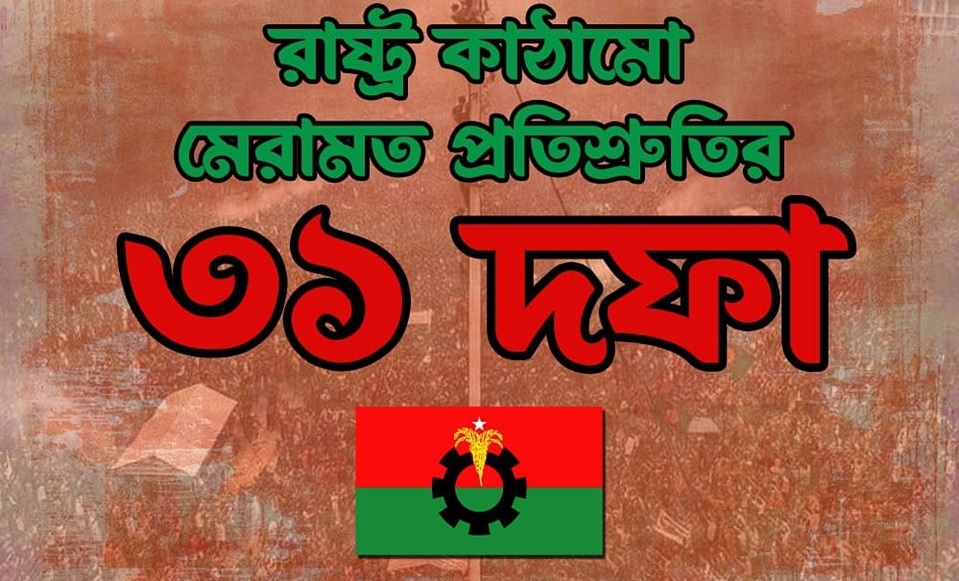 গত বছর ১৩ জুলাই দুপুরে গুলশানে এক সংবাদ সম্মেলনে বিএনপি মহাসচিব মির্জা ফখরুল ইসলাম আলমগীর এ ঘোষণা দেন। চলুন জেনে নেই বিএনপির এই ৩১ দফায় কী কী রয়েছে: