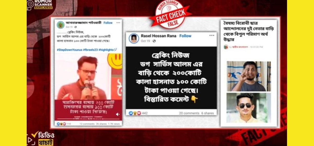 রিউমার স্ক্যানারের প্রতিবেদনে উল্লেখ করা হয়েছে, সারজিস আলম ও হাসনাত আবদুল্লাহর বাড়ি থেকে ২০০ কোটি ও ১০০ কোটি টাকা পাওয়ার দাবিটি সম্পূর্ণ ভিত্তিহীন। এ ধরনের ভুয়া তথ্য প্রচারের জন্য একটি খণ্ডিত ভিডিওকে ব্যবহার করা হয়েছে, যা বৈষম্যবিরোধী ছাত্র আন্দোলনের কেন্দ্রীয় নির্বাহী কমিটির সদস্য মো. তারিকুল ইসলামের বক্তব্যের একটি অংশকে ভুলভাবে উপস্থাপন করে ছড়ানো হয়েছে।